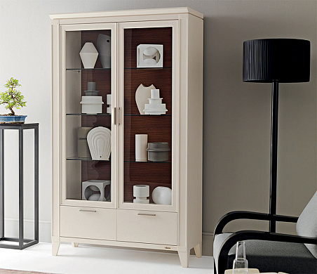Витрина со стеклянными дверьми и выдвижными ящиками. Размеры 122х45х206