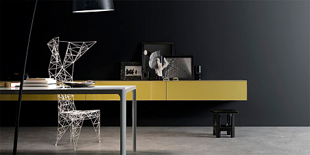 Итальянские кухни и мебель / Бренды / Rimadesio / Abacus Living / Композиция с подвесными ящиками, из лакированного глянцевого стекла ocra Abacus Living Rimadesio