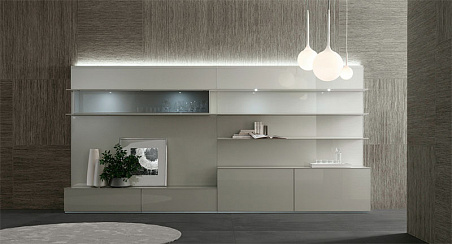 "Система хранения-алюминий+стекло Abacus living - это новая концепция системы гостиной. Дизайн включает в себя масштабную панель из лакированного стекла с безупречной поверхностью, которая ""играет"" отражениями и светом. На панели расположены выполненные целиком из стекла ящики с установленными в одной плоскости раздвижными дверцами , необычайно тонкие полки и витринный блок с подъемными створками. Задние стенки оборудованы светодиодной системой освещения в верхней и нижней секциях. Abacus living предлагает пять типов размеров по ширине и высоте, что позволяет реализовать исключительные возможности всевозможных сочетаний аксессуаров со стеклянными стеновыми панелями . Широкий выбор блоков хранения и аксессуаров для гостиной и зоны Hi-Fi позволяет создавать решения с изысканной стеклянной отделкой, адаптируемые под самые современные тенденции."