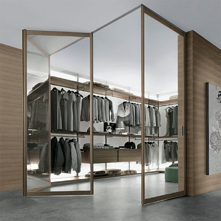 Итальянские кухни и мебель / Бренды / Rimadesio / Dress Bold / Гардеробная из алюминия и стекла и шпонированная перегородка со стеклом siparium Dress Bold Rimadesio
