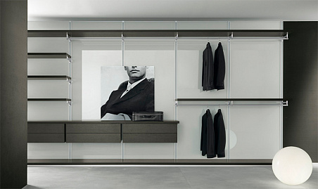 Итальянские кухни и мебель / Бренды / Rimadesio / Dress Bold / Гардеробная со стеклянными стеновыми панелями подвесными ящиками и полками из меламина Dress Bold Rimadesio