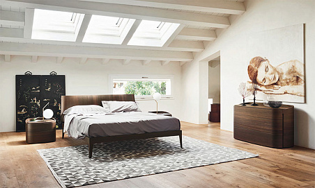 Кровать с мягкими, гладкими линиями и изогнутым изголовьем. Комод и прикроватная тумбочка в отделке термообработанного дуба